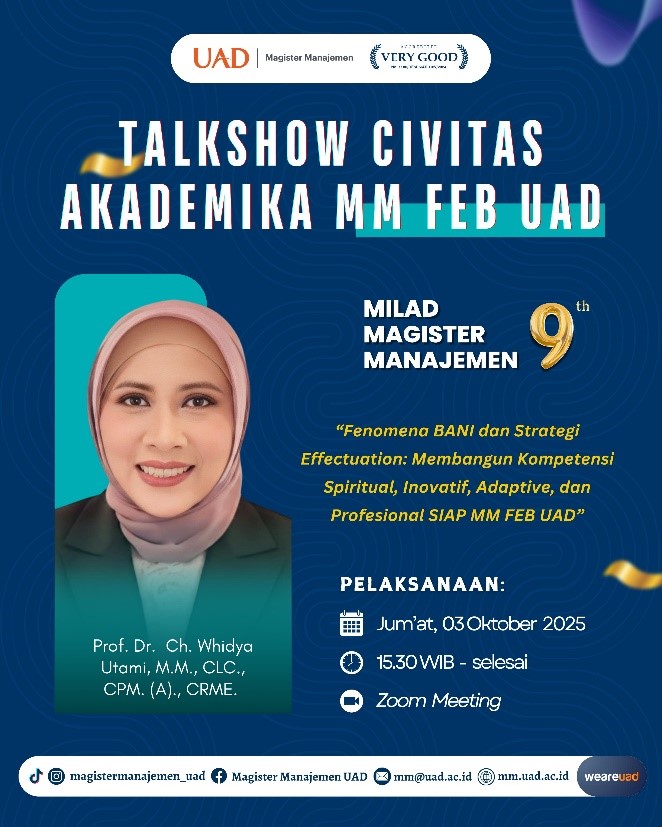/in berita prodi, Event, Pengumuman /by MM_UADYogyakarta – Program Studi Magister Manajemen Fakultas Ekonomi dan Bisnis Universitas Ahmad Dahlan (MM FEB UAD) menggelar kegiatan Talkshow Civitas Akademika sebagai rangkaian peringatan Milad ke-9 Magister Manajemen pada Jumat 3 Oktober 2025. Kegiatan ini diselenggarakan melalui Zoom Meeting dan diikuti oleh mahasiswa, dosen, serta alumni MM FEB UAD.