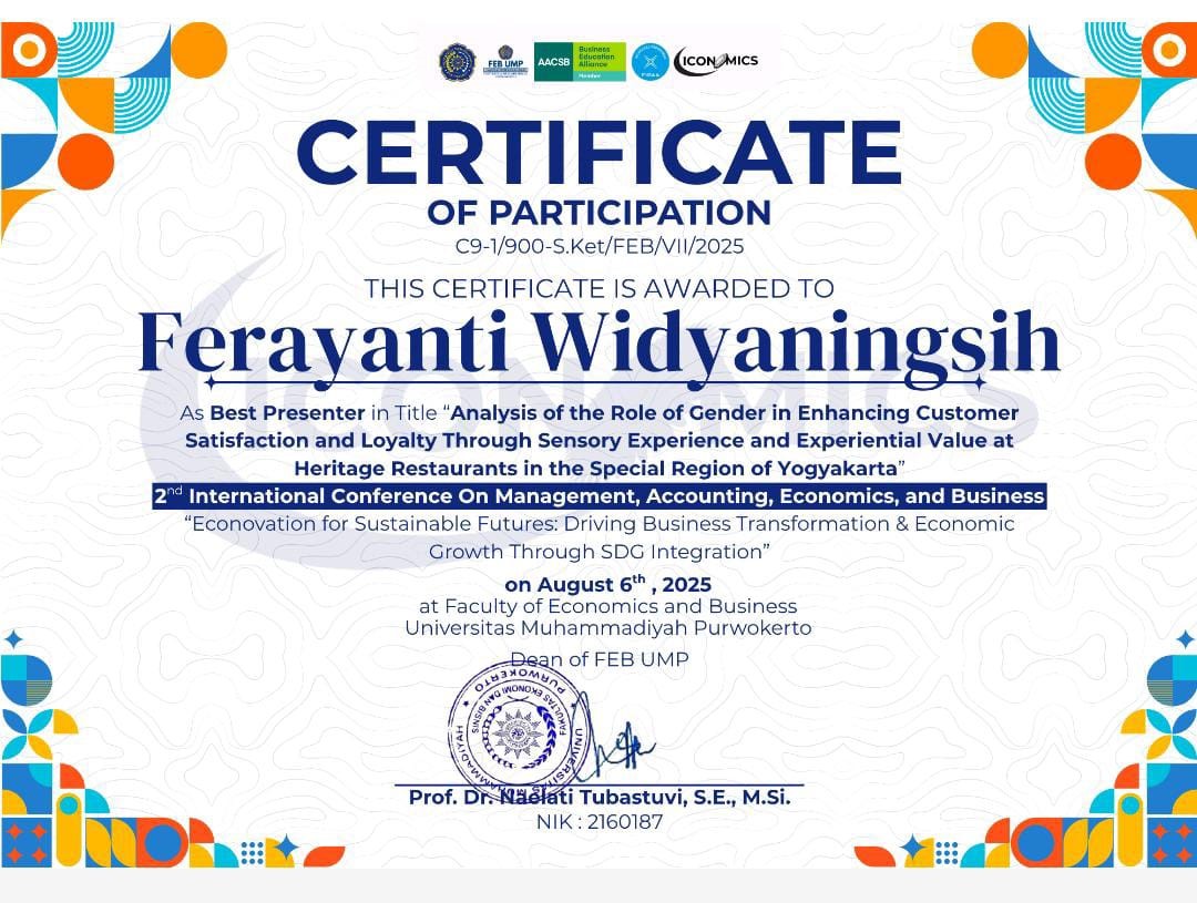 Penghargaan Best Presenter yang diterima Ferayanti menjadi bukti kontribusi nyata mahasiswa MM FEB UAD dalam forum ilmiah internasional. Dekan FEB UMP, Prof. Nanik Lestari Tubastuvi, SE, M.Si., memberikan apresiasi melalui sertifikat resmi sebagai bentuk pengakuan atas kualitas presentasi dan kekuatan argumentasi ilmiah yang disampaikan Ferayanti selama sesi konferensi.